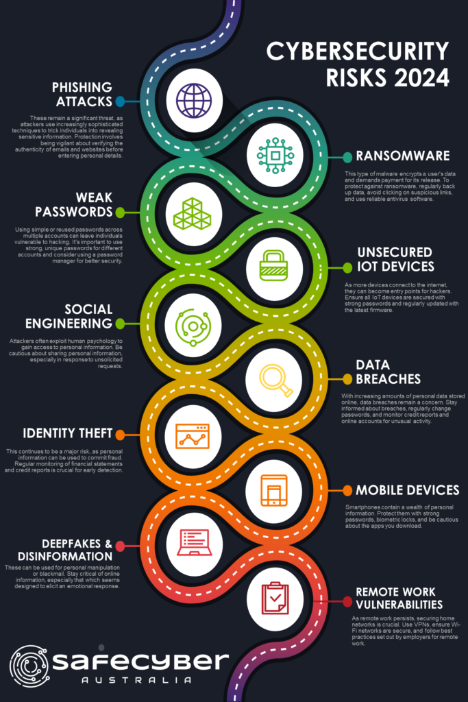 As we move into 2024, the landscape of personal cybersecurity risks continues to evolve. We’ve created an infographic featuring 10 of the most likely risks. We’ve also listed some basic strategies for protection: